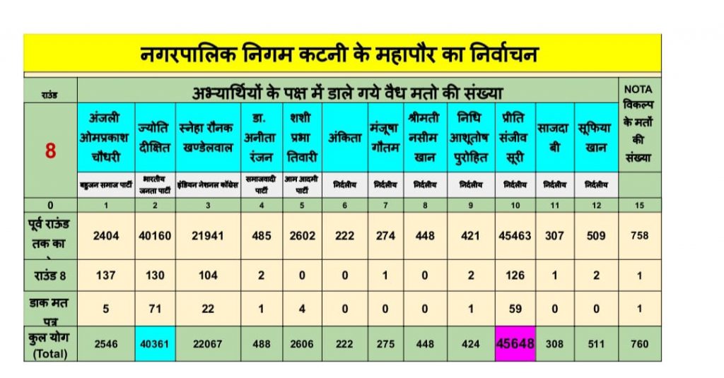 आठ चरणों में पूर्ण हुए मतगणना के बाद जिला निर्वाचन अधिकारी व कलेक्टर प्रियंक मिश्रा ने नव निर्वाचित महापौर व पार्षदों के निर्वाचन की घोषणा करते हुए नवनिर्वाचितों को बधाई दी और प्रमाण पत्रों का वितरण किया। महापौर पद के लिए आठ चरणों में ईवीएम से हुई गणना में सर्वाधिक 45648 मत निर्दलीय उम्मीदवार प्रीति संजीव सूरी को मिले, जबकि भाजपा प्रत्याशी ज्योति दीक्षित 40361 मतों के साथ दूसरे स्थान पर रहीं। कांग्रेस प्रत्याशी स्नेहा रौनक खंडेलवाल को 22067, अंजली ओमप्रकाश चौधरी को 2546, डॉ. अनीता रंजन को 488, शशिप्रभा तिवारी को 2606, अंकिता को 222, मंजूषा गौतम को 275, नसीम खान को 448, निधि आशुतोष पुरोहित को 424, साजदा बी को 308 और सूफिया खान को 511 मत प्राप्त हुए। कलेक्टर श्री मिश्रा ने प्रीति संजीव सूरी के निर्वाचित होने की घोषणा करते हुए प्रमाण पत्र प्रदान किया।