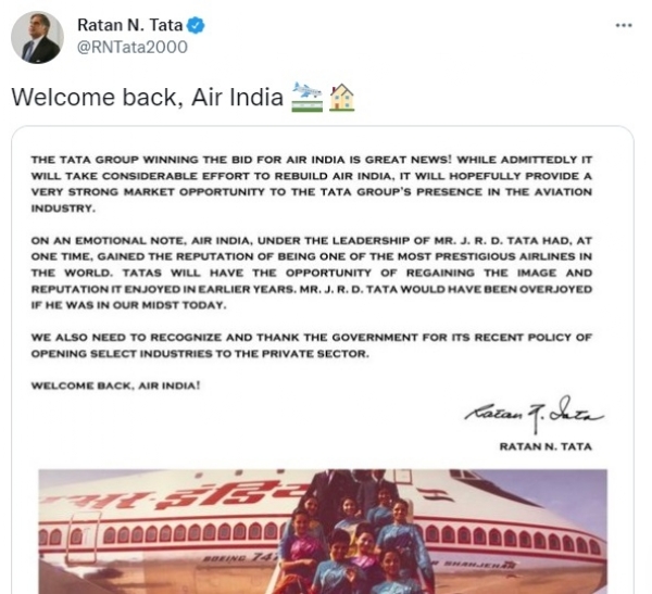 अपने ट्वीट में रतन टाटा ने यह भी कहा कि ‘एक वक्त ऐसा था, जब एयर इंडिया ने जेआरडी टाटा के नेतृत्व में ‘दुनिया की सबसे प्रतिष्ठित एयरलाइंस में से एक’ के तौर पर ख्याति बटोरी थी। लेकिन, अब टाटा समूह के पास वह इमेज और प्रतिष्ठा फिर से बनाने का मौका होगा, जो एयर इंडिया के शुरुआती सालों में थी। अगर आप जेआरडी टाटा हमारे बीच होते तो वे बेहद खुश होते।’ रतन टाटा ने अपने नोट में चुनिंदा इंडस्ट्रीज को निजी क्षेत्र के लिए खोलने की हालिया नीति के लिए सरकार को भी धन्यवाद दिया है।