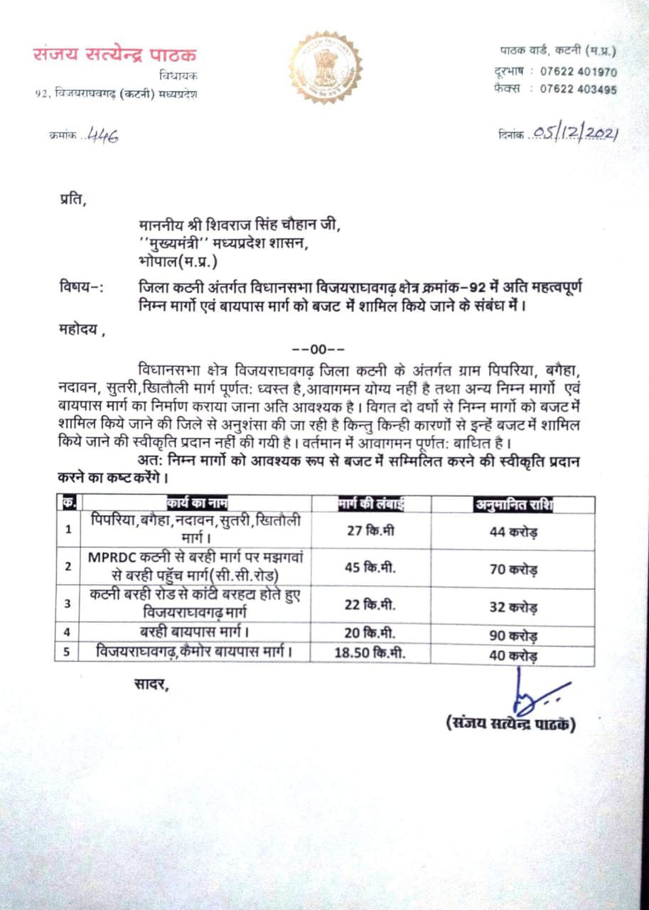 (कटनी) विजयराघवगढ़ विधानसभा के सतत विकास के लिये प्रयत्नशील रहने वाले विधायक संजय सत्येन्द्र पाठक ने भोपाल में प्रदेश के मुख्यमंत्री शिवराज सिंह चौहान से भेंट कर विधानसभा क्षेत्र विजयराघवगढ़ की प्रमुख मांग पिपरिया-बगैहा से नदावन-खितौली मार्ग , कटनी बरही मार्ग में मझगवां से बरही, बरही रोड से कांटी होते विजयराघवगढ़ मार्ग, बरही बायपास मार्ग, विजयराघवगढ़ कैमोर बायपास मार्ग को अतिशीघ्र निर्मित कराने के साथ क्षेत्र हितैषी महत्वपूर्ण निर्माण कार्यों की स्वीकृति हेतु अनुरोध किया।