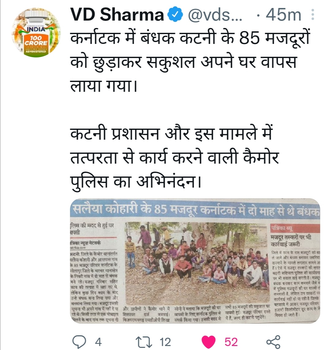 कर्नाटक में मजदूरी के लिए जबरन रोके गए ग्रामीणों को मुक्त कराने के लिए पुलिस द्वारा तत्परता पूर्वक की गई कार्यवाही की ग्राम वासियों ने सराहना कर कटनी पुलिस को धन्यवाद दिया हैं , जिन्होंने तत्परता पूर्वक उन्हें सकुशल अपने गृह जिले में वापसी करवाई।