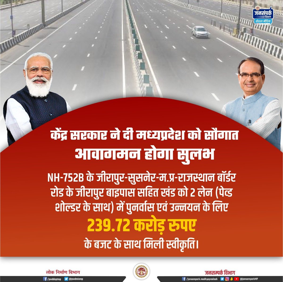मुख्यमंत्री श्री चौहान ने कहा है कि मध्यप्रदेश में एनएच-752 बी के जीरापुर-सुसनेर-मध्यप्रदेश-राजस्थान बॉर्डर रोड पर राजगढ़ जिले के जीरापुर के लिए केन्द्र सरकार द्वारा 239 करोड़ 72 लाख रूपये की बजट के साथ स्वीकृति दी गई है। प्रधानमंत्री श्री मोदी ने देश के हृदय प्रदेश मध्यप्रदेश के हितों का सदैव ध्यान रखा है।