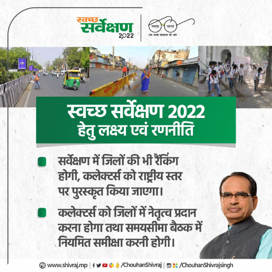 मुख्यमंत्री श्री चौहान द्वारा नगरीय क्षेत्रों में स्वच्छता अभियान की कार्यवाहियों की समीक्षा कॉन्फ्रेंस में की गई। स्वच्छ सर्वेक्षण 2021 में इंदौर ओडीएफ प्रमाणीकरण और वॉटर प्लस श्रेणी में प्रथम रहा है। कुल 74 निकायों को ओडीएफ प्लस और 295 निकायों को ओडीएफ डबल प्लस श्रेणी में शामिल किया गया है। स्वच्छ सर्वेक्षण 2022 के लिए जिलों की भी रैकिंग होगी और कलेक्टर्स को राष्ट्रीय स्तर पर पुरस्कृत किया जाएगा। प्रदेश के 378 नगरीय निकायों को ओडीएफ डबल प्लस, सभी नगर निगमों को 5 स्टार और शेष सभी निकायों को न्यूनतम 3 स्टार की रेटिंग दिलवाने का प्रयास है। प्रेरक दौर सम्मान गत वर्ष देश में 70 निकायों को मिला था। इस वर्ष मध्यप्रदेश की सभी नगर निगम न्यूनतम गोल्ड और शेष निकाय न्यूनतम सिल्वर श्रेणी में आएँ, ऐसा प्रयास किया जाए।