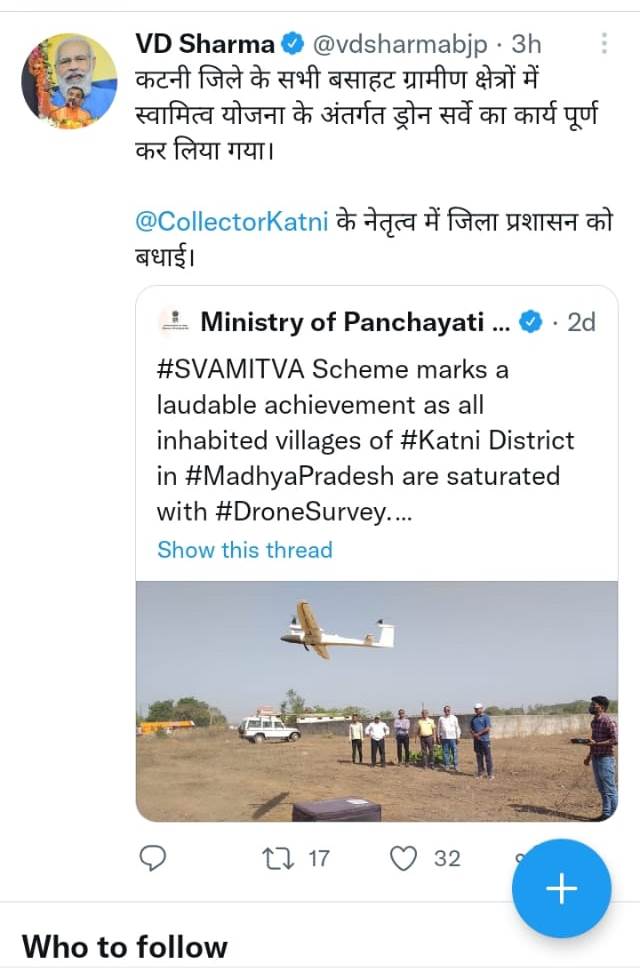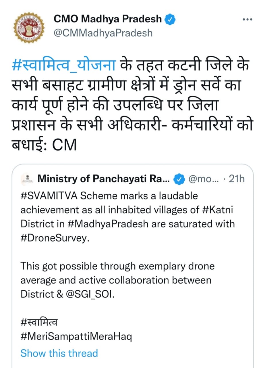 मुख्यमंत्री शिवराज सिंह चौहान ने कटनी जिले के स्वामित्व योजना में ग्रामीण क्षेत्रों में ड्रोन सर्वे के कार्य अमले की सराहना