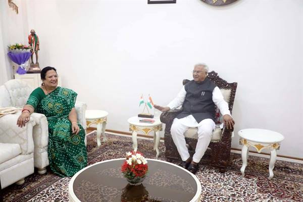राज्यपाल मंगुभाई पटेल से केन्द्रीय राज्य मंत्री श्रीमती दर्शनाबेन जरदोश ने की सौजन्य भेंट।