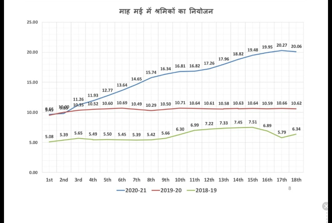पंचायत एवं ग्रामीण विकास विभाग के अपर मुख्य सचिव श्री मनोज श्रीवास्तव ने प्रजेंटेशन में बताया कि प्रदेश में वर्तमान में 20 लाख से अधिक श्रमिकों को मनरेगा कार्यो से रोजगार का बड़ा सहारा मिल रहा है। यहां तक कि साढ़े सत्रह हजार दिव्यांग भी कार्यो से जुड़े हैं। प्रति ग्राम पंचायत औसतन 90 श्रमिक काम कर रहे हैं। प्रदेश में गत वर्ष मई माह में करीब 10 लाख श्रमिक ही मनरेगा कार्यों से जुड़े थे। इस वर्ष इनकी संख्या बढ़कर 20 लाख अर्थात दोगुनी हो गई है।