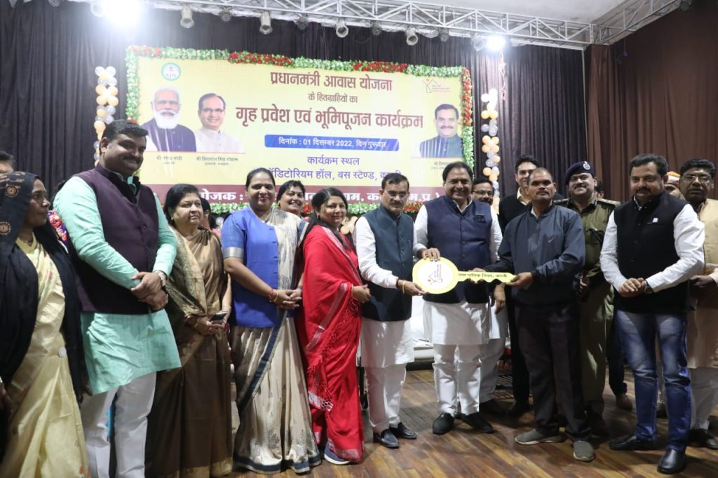 (कटनी)- नगर निगम आडिटोरियम में प्रदेश भाजपा अध्यक्ष तथा क्षेत्रीय सांसद विष्णुदत्त शर्मा ने गृह प्रवेश कार्यक्रम में पात्र लोगों को पीएम आवास योजना के अंतर्गत हितग्राहियों को चाबी सौंपी। इसके पूर्व भारत माता माँ सरस्वती के तैल चित्र पर माल्यार्पण तथा दीप प्रज्वलन के साथ कार्यक्रम प्रारम्भ हुआ। इसके बाद सांसद श्री शर्मा ने कन्याओं का पूजन किया। 816 लोग गृह प्रवेश कर रहे हैं। करीब 916 घरों का भूमि पूजन किया गया।