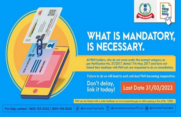 आयकर विभाग ने शनिवार को ट्विट कर बताया कि आयकर अधिनियम, 1961 के अनुसार सभी पैन धारकों के लिए जो छूट की श्रेणी में नहीं आते हैं, 31 मार्च 2023 तक अपने पैन को आधार से जोड़ना अनिवार्य है। जो पैन आधार कार्ड से नहीं लिंक किए गए हैं, वे पैन 01 अप्रैल 2023 से निष्क्रिय हो जाएंगे।