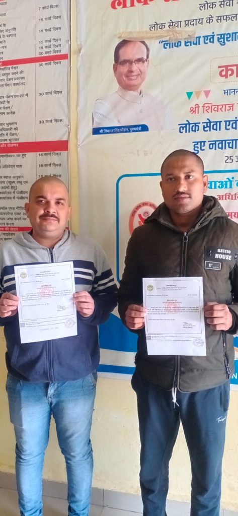 (कटनी)- सुशासन सप्ताह के तहत जिले मे कलेक्टर अवि प्रसाद के निर्देश पर लोगों को त्वरित जनसुविधांए मुहैया कराई जा रही है। इसी क्रम मे आवेदक सतीश कुमार गुप्ता एवं आशीष कुमार गुप्ता निवासी ग्राम देवरी मझगवां को तत्काल सेवा मुहैया कराई जाकर आय प्रमाण पत्र प्रदाय किया गया।
