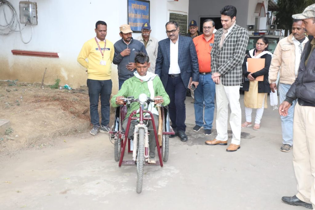आयुक्त निःशक्तजन और कलेक्टर अवि प्रसाद ने दिव्यांग नरेश को दी ट्राई साइकिल और सुनने की मशीन