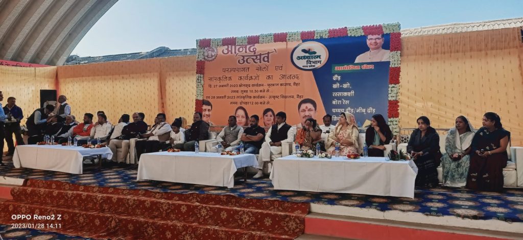 (मैहर) मध्यप्रदेश शासन के निर्देश अनुसार आनन्द महोत्सव का आयोजन नगरपालिका परिषद् मैहर द्वारा किया जा रहा है। जिसमे मुख्य अतिथि श्री गणेश सिंह सांसद सतना विशिष्ठ अतिथि नारायण त्रिपाठी विधायक मैहर थे लेकिन किसी कारण वश कार्यक्रम में नही शामिल हुए,एवम कार्यक्रम की अध्यक्षता श्रीमति गीता संतोष सोनी अध्यक्ष नगरपालिका परिषद् मैहर एवं श्रीमती शीतल नितिन ताम्रकार उपाध्यक्ष नगर पालिका परिषद मैहर द्वारा की माँ शारदा की प्रतिमा पर पुष्प से पूजन अर्चन कर कार्यक्रम का शुभारंभ किया गया वही सांसद व विधायक के इंतजार के कारण कार्यक्रम 12 बजे के स्थान पर करीब पौने दो बजे सुरु किया गया कार्यक्रम सुरु होने के बाद जनपद पंचायत उपाध्यक्ष विकास त्रिपाठी पहुचे, इस आनन्द उत्सव के कार्यक्रम में विभिन्न प्रकार के कार्यक्रम का आयोजन आज होना है सांस्कृतिक कार्यक्रम, परंपरागत खेलो का आयोजन कार्यक्रम स्थल सी. एम राइज़ (उत्कृष्ठ विद्यालय) में आयोजन सुरु किया गया।