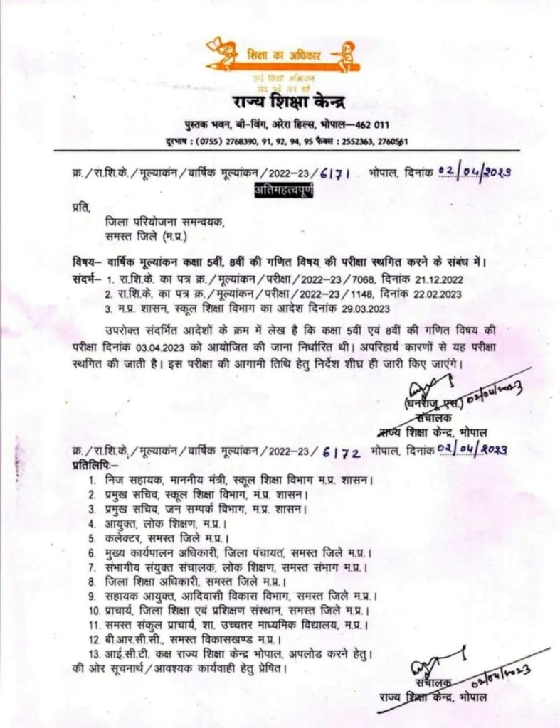 मध्यप्रदेश में 3 अप्रैल को आयोजित 5वीं और 8वीं बोर्ड परीक्षा गणित का पेपर स्थगित, गोपनीयता भंग होने पर 8वीं बोर्ड संस्कृत का पेपर निरस्त