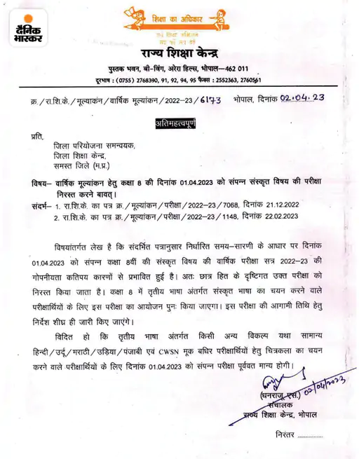 र दिया गया है। अब इसको आगामी दिनांक को कराया जाएगा। इसको लेकर राज्य शिक्षा केंद्र भोपाल के संचालक धनराजू एस ने प्रदेश के समस्त जिला परियोजना समन्वयक को पत्र भी जारी कर दिया है। इसमें बताया गया है कि संस्कृत पेपर की गोपनीयता कतिपय कारणों से प्रभावित हुई है। इसको देखते हुए इसे निरस्त किया गया है।
