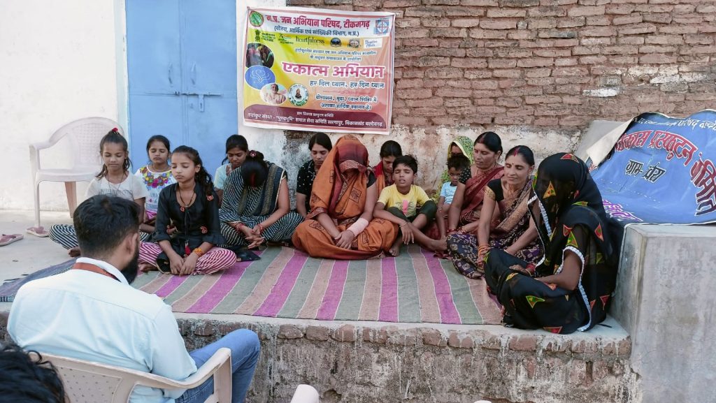(खरगापुर) हार्ट फुलनेस संस्थान हैदराबाद द्वारा म.प्र.जन अभियान परिषद के जिला समन्वयक ड्रा सुनील कटियार जी ओर बी सी ललित शर्मा के कुशल मार्गदर्शन में नवांकुर संस्था पुण्यभूमि समाज सेवा समिति खरगापुर के तत्वावधान में ग्राम विकास प्रस्फुटन समिति फुटेर चक्र २, फुटेर चक्र १, टीला, मातौल, खेरा विकासखंड बलदेवगढ़ सेक्टर देरी में प्रथम दिवस लोगों को योगासन – प्राणायाम – अनुलोम – विलोम कपालभाति – मुद्रा आसन – ध्यान- भ्रामरी योगासन करवाऐ गए।