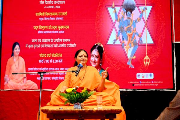 कार्यशाला के अगले सत्र में चिन्मय मिशन कोयंबटूर की प्रमुख स्वामिनी विमलानंद सरस्वती ने कहा कि कला का सौन्दर्य आनंद में है। कला की विशेषता है कि उसमें सदैव नवीनता विद्यमान होती है। उन्होंने कहा कि भगवान आसन पर बैठे तो कला है और चलें तो नृत्य है। स्वामिनी ने कहा कि नृत्य भी एक साधना है, जिससे मन परिष्कृत होता है। चर्चा सत्र को आगे बढ़ाते हुए स्वामिनी विमलानंद ने वेदांत का उदारहण देते हुए कहा कि आत्मज्ञान के लिए मन की शुद्धता, सूक्ष्मता एवं एकाग्रता आवश्यक है। आत्मज्ञान की प्राप्ति ज्ञान मात्र से होती है, इसलिए आवश्यक है कि मन राग, द्वेष से मुक्त हो।