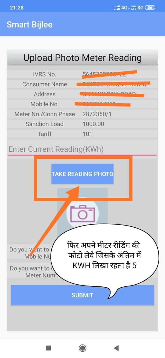 मध्य प्रदेश पूर्व क्षेत्र विद्युत वितरण कंपनी के द्वारा उपभोक्ताओं की सुविधाओं को देखते हुए सेल्फ फोटो रीडिंग की सुविधा प्रदान की गई है। इसके माध्यम से उपभोक्ता स्वयं भी अपने विद्युत खपत की जानकारी उपलब्ध करा सकते हैं। उपभोक्ताओं को सर्वप्रथम गूगल प्ले स्टोर में उपलब्ध स्मार्ट बिजली एप डाउनलोड करना होगा। इसके पश्चात गेस्ट यूज़र के तौर पर लॉगिन करें। ओपन हुई अगली विंडो (पेज) पर मीटर रीडिंग अपलोड फ़ोटो ऑप्शन का चयन करें। इसके पश्चात ओपन हुई अगली विंडो में उपभोक्ताओं को अपने विद्युत कनेक्शन सम्बंधी जानकारी (आईवीआरएस नम्बर) की प्रविष्टि करनी होगी। इसके पश्चात अगली विंडो में एप के माध्यम से मीटर रीडिंग (जिसमें KWH) लिखा रहता है, उसकी फ़ोटो लें तथा रीडिंग की अंको में भी प्रविष्टि कर सबमिट करें। इस सरल प्रक्रिया के माध्यम से उपभोक्ता विद्युत खपत की जानकारी भेज सकते हैं। यह सुविधा प्रत्येक माह की 10 से 15 तारीख़ के मध्य उपलब्ध रहेगी।
