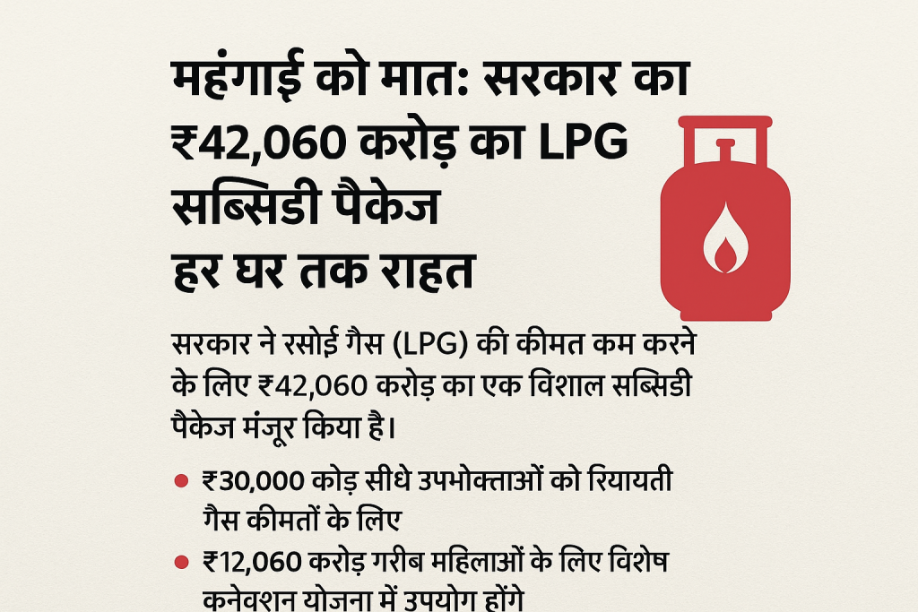 (नई दिल्ली) — महंगाई की मार झेल रहे आम नागरिकों के लिए केंद्र सरकार ने सोमवार को एक बड़ा तोहफ़ा दिया है। प्रधानमंत्री नरेंद्र मोदी की अध्यक्षता में हुई कैबिनेट बैठक में ₹42,060 करोड़ के अभूतपूर्व LPG सब्सिडी पैकेज को मंजूरी दी गई। सरकार का दावा है कि इस योजना से देश के 33 करोड़ से अधिक घरेलू उपभोक्ताओं को सीधे फायदा मिलेगा।