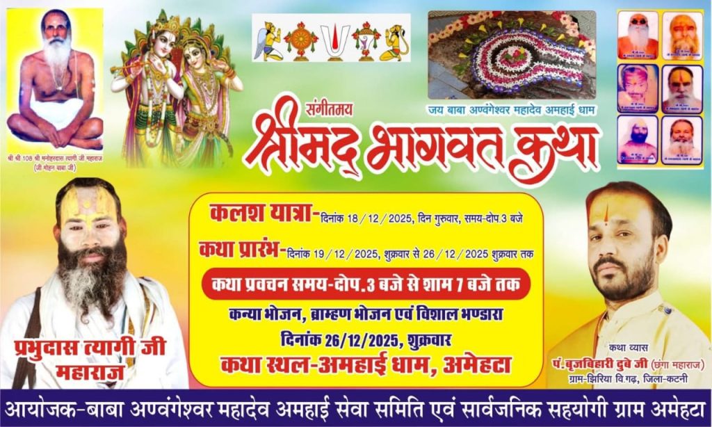 अमहाई धाम में 19 से 26 दिसंबर तक श्रीमद् भागवत कथा, 18 को निकलेगी भव्य कलश यात्रा