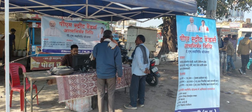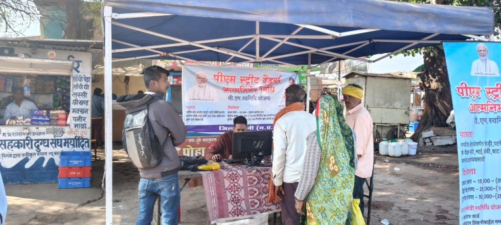 (कटनी) – नगर निगम सीमान्तर्गत छोटा व्यवसाय करने वाले पथ विक्रेताओं को प्रधानमंत्री स्वनिधि योजना के तहत ऋण उपलब्ध कराकर उनके व्यवसाय को सुदृण करने तथा जीवनस्तर में सुधार लाते हुए आर्थिक आत्मनिर्भरता प्रदान करने के उद्देश्य से निगम प्रशासन द्वारा जोनवार आयोजित किये जा रहे शिविरों के तहत गुरुवार को बस स्टैंड पुलिस चौकी के समीप शिविर का आयोजन किया गया। शिविर के दौरान पहुंचे विभिन्न हितग्राहियों को योजना के संबंध में विस्तार से जानकारी प्रदान की जाकर पात्र 26 हितग्राहियों के आवेदन पत्र भरकर ऋण उपलब्ध कराने हेतु बैंकों की ओर प्रेषित किये गए।
